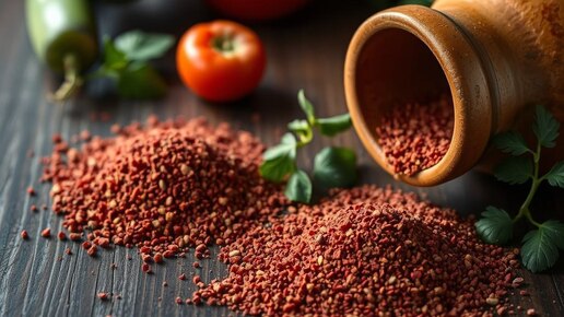 Сумах — это специя, получаемая из высушенных и перемолотых ягод одноимённого кустарника. Эти мелкие ягоды имеют ярко-красный цвет и собираются в крупные метёлки. После сушки на солнце их растирают в грубый бордовый порошок, иногда добавляя соль для лучшего сохранения. Вкус сумаха — это чистый, фруктовый кислый тон, лишённый агрессивности уксуса или лимонной кислоты. Он скорее освежает, чем просто закисляет. Аромат слабый, чуть терпкий, с древесными нотками. Важно отличать настоящий кулинарный сумах...