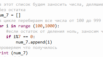 Условие: Найти все такие трёхзначные числа которые кратны 7, причём сумма всех цифр этого числа также должно быть кратно семи. Вывести их количество. Разобьём задачу на несколько подзадач. Проверка делимости трёхзначных чисел на 7. Это самая простая подзадача. Здесь с помощью цикла и функции range() нужно перебрать все трёхзначные числа, проверяя - равен ли остаток от деления текущего числа на 7 нулю. Если да, то заносим это число в список num_7. получаем вот такущий список: Считаем суммы цифр всех чисел списка num_7...
