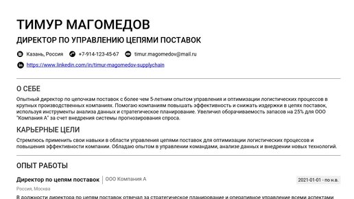 Изучите пример резюме supply chain director, чтобы составить собственный документ, который точно привлечет внимание рекрутера и приведет к приглашению на собеседование. Наш готовый пример поможет понять, как эффективно представить ваш опыт и навыки для успешного получения желаемой должности в области управления цепями поставок. Здесь представлены готовые примеры и пошаговые инструкции по каждому ключевому разделу эффективного резюме supply chain director, чтобы учесть специфику этой роли: Мы подробно...