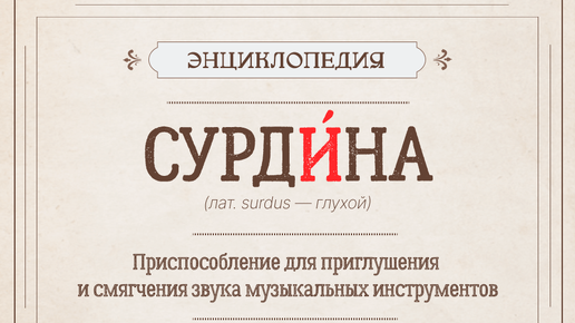 Сурдина – приспособление для музыкальных инструментов, которое используют для приглушения и смягчения звука. Основная функция сурдины – существенно уменьшать громкость звучания инструмента, а также частично изменять его тембр. Изначально surdus с латыни переводится как «глухой». В нотах использование сурдины обозначается ремаркой con sordino. Сурдины в основном используются для струнных