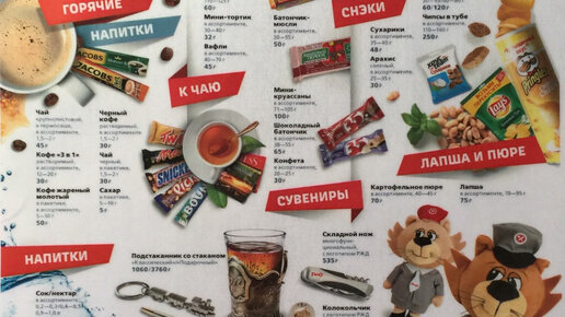 Здравствуйте, дорогие наши читатели! Сегодня мы с вами пролистаем один из двух журналов, предложенных ФРК РЖД пассажирам купейного вагона фирменного поезда Москва-Анапа. В нём представлены товары в дорогу, которые можно купить у проводника любого вагона, включая плацкарт.  Думается, вам будет интересно посмотреть, как на ассортимент, так и на его цены. Ну, а если вы планируете путешествовать поездом, то знать о возможных вариантах покупки заранее, ещё и полезно! ГОРЯЧИЕ НАПИТКИ ДЕСЕРТЫ ПРОДУКЦИЯ...