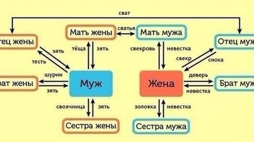 Свёкор — отец мужа Свекровь — мать мужа Тесть — отец жены Тёща — мать жены Деверь — брат мужа Шурин — брат жены Золовка — сестра мужа Свояченица — сестра жены Свояк — муж свояченицы Зять — муж дочери, муж сестры, муж золовки Сноха — жена сына по отношению к отцу Невестка — жена брата, жена сына для его матери, жена одного брата по отношению к жене другого брата; употребляется также вместо сноха, золовка, свояченица Сват — отец одного из супругов по отношению к родителям другого Сватья...