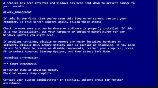 Если у вас после включения компьютера и при запуске Windows возник вдруг синий экран с текстом, в конце которого присутствуют такие строки Beginning dump of physical memory Physical memory dump complete. (Перевод: Приступаю к сбросу физической памяти Сброс физической памяти) и перезагрузка ПК никак не помогает, то скорее всего у вас проблемы с оперативной памятью. А точнее один из модулей ОЗУ вышел из строя. Чаще всего подобную проблему можно решить собственными усилиями, в домашних условиях и не обращаясь к специалистам...