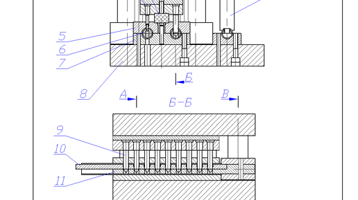 Штамп пробивки и отбортовки стенки трубы (далее штамп) относится к обработке металлов давлением, а именно к технологическим операциям холодной штамповки и в частности предназначен для создания бортов внутри алюминиевой трубы вокруг предварительно пробитых отверстий в её стенке и может быть использован для изготовления коллекторов. Конструкция штампа показана на Рис.1. На первой позиции штампа пуансонами 2 пробиваются отверстия в стенке трубы, установленной на матрице 6 с диаметром соответствующим внутреннему диаметру трубы и позволяющим установить и снять заготовку...
