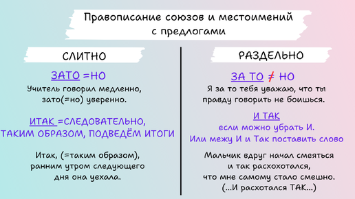 Есть слова, написание которых ставит в тупик. Их нельзя просто так взять и написать слитно или раздельно. Хотя как их раздельное, так и слитное написание - верно, в зависимости от того какой частью речи они являются. Если союзами - слитно, а если другими частями речи - раздельно. Не ошибиться помогут несколько секретов, которыми я поделюсь. Готовы? Тогда начинаем! Если ЗАТО можно заменить НО, пишем слитно ЗАТО=НО Учитель говорил медленно, зато(=Но) уверенно. А если заменить нельзя, то перед нами предлог ЗА и указательное местоимение ТО, пишем раздельно...