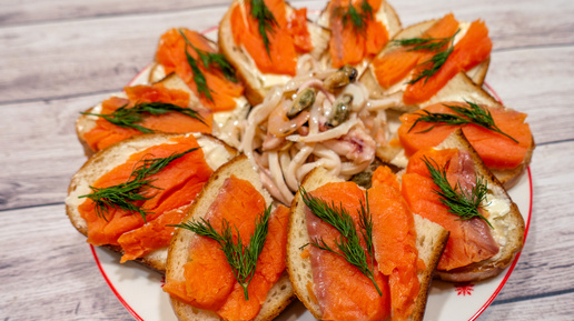 Друзья, иногда с праздничными закусками совсем нет времени заморачиваться, ведь гости уже на пороге. В таких чрезвычайных ситуациях меня всегда выручает быстрая и очень вкусная морская тарелка, которую можно "собрать" буквально за 5 минут. Ну или за 10 минут в крайнем случае, если что-то пойдет слегка не по плану!😉 Слабосоленая красная рыбка и консервированные морепродукты или морской коктейль - эти две составляющие сыграют сегодня ключевую роль. Не забудем также про батон или багет, а также сливочное масло, свежий укроп - будет украшением наших быстрых бутербродов...