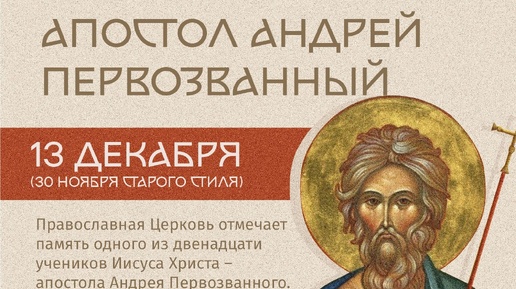 13 декабря (30 ноября старого стиля) Православная Церковь отмечает память одного из двенадцати учеников Иисуса Христа – апостола Андрея Первозванного. Апостол Андрей Первозванный издавна почитался на Руси. В «Повести временных лет» сообщается о его путешествии по Днепру, по будущему маршруту «из варяг в греки», с воздвижением креста на месте будущего Киева, и посещением земли ильменских словен...