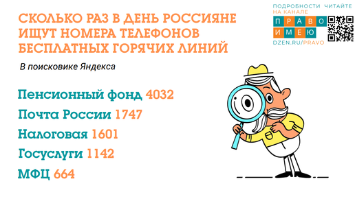 Более пяти миллионов раз каждый месяц россияне ищут телефоны бесплатных горячих линий в Яндекс-поиске. В 93% случаях людям нужны номера справочных служб банков, мобильных операторов, маркетплейсов и других коммерческих организаций. В основе остальных 7% лежат вопросы к государству. Чтобы получить на них ответы, граждане разыскивают телефоны горячих линий Пенсионного фонда (СФР), налоговой службы, приставов, Госуслуг, МФЦ, Генпрокуратуры и т.п., включая администрацию президента. Канал ПРАВО ИМЕЮ проанализировал...