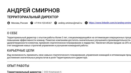 Пример резюме территориального директора — ваш первый шаг к созданию документа, который эффективно представит ваш опыт и навыки. Изучив готовые примеры, вы сможете составить резюме, которое поможет получить работу мечты. 🚀 В этом материале мы предлагаем не просто примеры, а подробное руководство, как составить эффективное резюме территориального директора, учитывая актуальные требования работодателей. Вы найдете: Изучив пример, вы сможете создать резюме с помощью нашего конструктора резюме. Для...