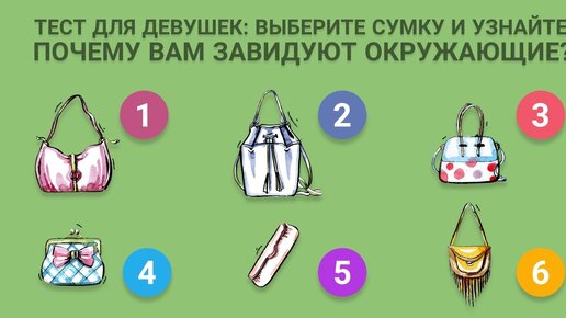 Зачастую мы видим злобные взгляды знакомых и друзей. Вот только за этой злобой или отрешённостью может скрываться самая настоящая зависть. Чаще всего это происходит в кругу общения среди девушек. Сегодня вы сможете узнать, чем же вы выделяетесь из толпы, и почему вам завидуют окружающие вас люди. Для того чтобы пройти тест, от вас требуется лишь не задумываясь выбрать ту сумочку с которой вы бы пожелали отправиться на встречу с друзьями. Ниже прочитайте советующую расшифровку. Сумка №1 Вы с лёгкостью умеете находить подход к любому человеку...