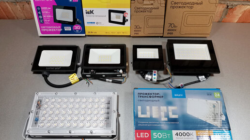 В магазинах Леруа Мерлен продаётся много разных светодиодных прожекторов. Я изучил пять прожекторов разных производителей с указанной мощностью 30-70 Вт и ценой 500-700 рублей. В тесте приняли участие прожекторы Lumin'arte, IEK, Apeyron, а также два безымянных прожектора, а названии у которых только цифры. У большинства дешёвых прожекторов две беды - стопроцентная пульсация, делающая свет неприятным и в некоторых случаях приводящая к головным болям и обострению нервных заболеваний и завышение мощности...