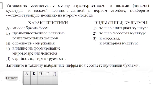 Разберём что такое виды типы культур. Элитарная культура — это культура, предназначенная для узкого круга людей (элиты). Простыми словами, это «высокая культура», которая не распространена в широких массах из-за специфических особенностей и трудностей для восприятия неподготовленным человеком.Например:балет,классическая музыка,литература(произведения В. Шекспира, Ф. Достоевского, Кафки, которые не всегда понятны для широкой аудитории)...