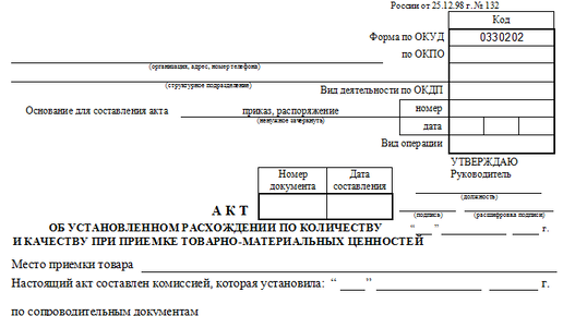 Бланк унифицированной формы ТОРГ-2 С 01.01.2013 у организаций есть право выбора того, какие формы документов они будут использовать для оформления фактов хозяйственной жизни — унифицированные или разработанные самостоятельно. Подробнее об этом — в статье «Первичный документ: требования к форме и последствия ее нарушения». Если для вас привычнее первый вариант, то акт о расхождениях по количеству и качеству полученных ТМЦ оформляется на бланке унифицированной формы ТОРГ-2, которая утверждена постановлением Госкомстата РФ от 25...