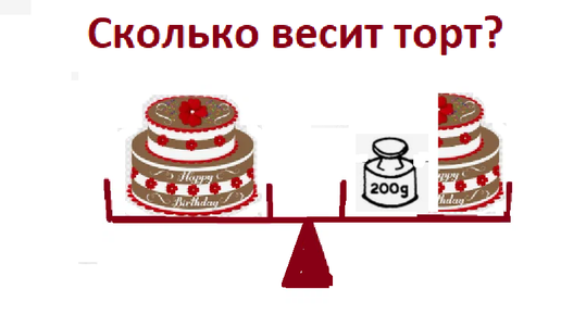 Приветствую читателей и подписчиков канала Тесты_математика! Когда на весы поставили торт, а вторую половину торта поместили на другую чашу весов, то понадобилась гиря в 200 граммов для уравновешивания весов. Когда гирю подобрали, получилось, что вес гири оказался 200 г. В этом суть задачи. Рисунок неуравновешенных весов. Это рисунок уравновешенных весов с вопросом вместо гири...