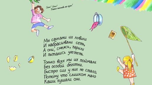 Вдруг подул однажды ветер, Песню громкую запел, И взлетели в небо дети, Те, кто мало каши ел. Мы сачками их ловили И набрасывали сеть, А они, смеясь, парили И пытались улететь. Только всех мы их поймали Без особой беготни...