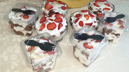 Что нам потребуется: Яйца Сахар Сода. Кефир Сливочное масло Какао. Мука Сливки 33% Сахарная пудра Бананы Клубника 🍓 Стаканчики для трайфла. Рецепт бисквита: 3 яйца. 1 ст. сахара. 1 ст кефира. 50 гр сливочного масла . 1 ст ложка соды. 3 ст л какао. Мука на глаз. Все ингредиенты перемешиваем и отправляем в духовку до готовности, проверяем спичкой. Подготовить наши стаканчики пиала и т д. Крем взбитые сливки:...