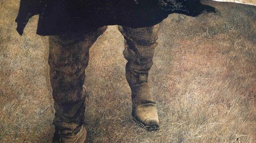 В этой весьма необычной композиции Эндрю Уайет (годы жизни 1917-2009) изобразил человека, идущего по осеннему холму, но мы видим человека только ниже колен, в старых, прочных, коричневых ботинках и с развевающимся на ветру подолом пальто. Как это типично для Уайета, трава и сорняки, составляющие собой поле, изображены с предельной детализацией и ясностью при помощи его техники сухой кисти. Он часто метафорически описывал темперную краску как нечто подобное земле, и был глубоко впечатлён этюдами природы от Альбрехта Дюрера (годы жизни 1471-1528), особенно его пучками травы...