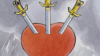 Карта тройка мечей в раскладах является недобрым знаком, который указывает на то, что человек находится в критическом состоянии. Причем загнал в эту ловушку он себя, скорее всего, сам потому, что не может адекватно воспринимать ситуацию и относится к событиям слишком эмоционально. Ключевое значение тройки мечей: боль, страдания, несчастная любовь, внутренние противоречия. Очень закрытая и очень сложная для прочтения в раскладах карта. Обычно, если выпадает тройка мечей, к ней лучше всего достать дополнительную карту...
