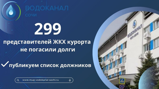 Управляющие компании задолжали водоканалу сумму в размере 97 138 27,24 рублей. Об этом сообщает пресс-служба МУП г. Сочи "Водоканал". 299 представителей ЖКХ курорта не погасили долги- эта задолженность негативно сказывается на качестве и стабильности водоснабжения в нашем городе. Мы призываем все управляющие компании оперативно урегулировать финансовые обязательства перед водоканалом, чтобы обеспечить бесперебойную работу систем водоснабжения и избежать возможных перебоев для жителей. Ответственный...