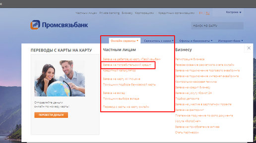 Промсвязьбанк выдает потребительские кредиты наличными физическим лицам по предварительно одобренной заявке, оформленной в режиме онлайн. Кредитные продукты и основные условия Банк предлагает несколько кредитных продуктов, по которым заемщики могут оформить онлайн заявку в дистанционном режиме: Промсвязьбанк при просрочке платежа вправе взыскать с должника пени в размере 0,06% от суммы просроченной задолженности по основному долгу и по процентам за каждый день просрочки с даты ее возникновения до даты погашения, но не более 20% годовых...