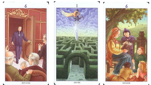 Если стены лабиринта - не камень, а всего лишь живая изгородь, то всегда есть вариант прорубиться к выходу мечом. Такую простую и соблазнительную мысль подсказывает нам Туз. Посмотрим, что я упустил... Нет, это все же не о движении напролом. Меч здесь символ знания, может, наличия в голове исчерпывающего плана того самого лабиринта...