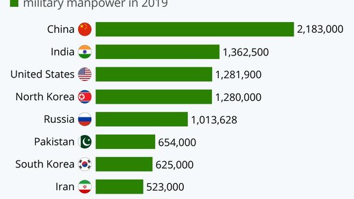 Рейтинговое агентство Global Firepower решило подсчитать, у какой же страны самая крупная армия в мире. Подсчет производился по итогам 2019 года. В свете напряженности ситуации на Ближнем Востоке весьма интересные результаты. 1 место. Китай - 2 183 000 человек. Кому как не Китаю занимать данную позицию с учетом населения этой страны. В последнее время китайские инструкторы стали даже появляться на африканском континенте. 2 место. Индия - 1 362 500 человек. Индия как и Китай обладает таким огромным населением, что данная численность служащих в армии не столь уж и огромна на общем фоне...