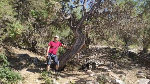 🌳 Арча «У Лукоморья дуб зелёный» Чуть выше большого валуна тропа делает небольшой подъём, и именно здесь стоит она — та самая кривая арча, которую мы когда-то назвали «У Лукоморья дуб зелёный». Название прилипло в ту же секунду, когда мы впервые её увидели: изогнутый ствол, закрученный в дугу, ветви, уходящие в разные стороны, и корни, будто цепляющиеся за скалу, как в старой сказке. Арча стоит не просто криво — она изгибается так, будто когда-то пыталась уйти от ветра или спрятаться от снега, и в результате застыла в идеальном, сказочном положении...