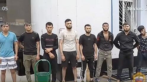 Подозреваемые в убийстве Сергея Чуева. Кадр из видео ГУ МВД по Москве Шестеро таджикистанцев, задержанных по подозрению в убийстве мастера спорта по греко-римской борьбе Сергея Чуева на юго-западе Москвы, арестованы до 8 августа...