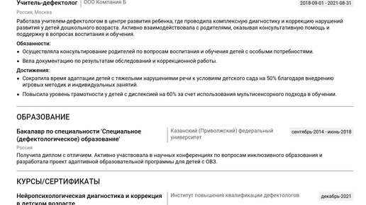 Пример резюме учителя-дефектолога поможет вам быстро составить эффективное представление о своем опыте и навыках. Изучение готовых примеров — лучший способ создать резюме, которое привлечет внимание работодателя и поможет получить желанную работу. На этой странице вы найдете готовые примеры резюме учителя-дефектолога для разного уровня опыта и подробные пошаговые инструкции по его составлению. Мы рассматриваем каждый раздел, от контактов до навыков, с учетом актуальных требований работодателей,...