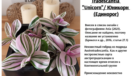 Традисканция Юникорн/Unicorn - относится к виду Альбифлора (приречная, белоцветковая). Имеет кустистое строение и ампельный тип роста. Листья овальной формы, с нежного бело-розоым оттенком и с яркими зелеными полосами. Несмотря на неприхотливость в уходе, жаростойкость этой традисканции не очень высокая, поэтому в жаркие дни ей необходимо обеспечить дополнительную влажность. Это поможет предотвратить перегрев растения. Должен быть регулярным, но не избыточным...