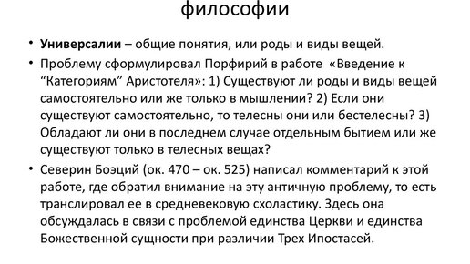 Средневековое понятие универсалий возникло на базе учения Платона об идеях, которые, будучи «присущи» конкретным вещам некоторого вида, определяют их природу, являясь их идеальной моделью, а кроме того — причиной и целью этих вещей; близко к этому и учение Аристотеля о формах...