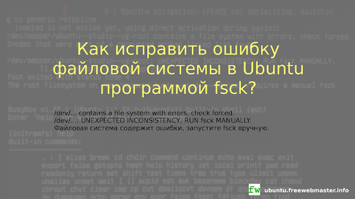 Как исправить ошибку файловой системы в Ubuntu программой fsck? Если, вместо загрузки операционной системы, у вас появляется предупреждение о повреждении файловой системы, проверить и исправить ошибки в файлах указанного раздела поможет запуск программы fsck (file system consistency check - проверка целостности файловой системы).