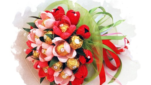 Букеты из конфет – идеальные сладкие подарки, созданные своими руками, которые можно подарить любому: и женщине, и ребенку, и мужчине, причем практически на любой праздник или даже просто без повода. Позднее букет можно разобрать, а конфетки съесть. Букет из конфет – не простой банальный подарок, а настоящий сюрприз, который будет всегда уникальным. Букеты бывают в самых разнообразных вариантах и цветах А сейчас я покажу как можно сделать красивый букет из конфет с тюльпанами из гофрированной бумаги и упаковать букет в кулечек из бумаги для скрапбукинга или картона...