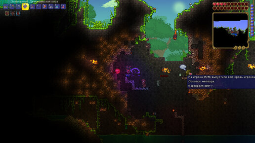 Всем привет! Статейки каждый день теперь вновь вернулись! Считайте, что это было небольшой отдых от этого дела. Сегодня же будет новая часть по террарии, которую я хоть и со спехом сделал, но сделал. Я решил прогуляться до скелетрона, ибо сегодняшняя цель - попробовать сразиться с ним. Но так как была кровавая луна, то я решил просто дойти до места битвы и встать в афк. Но когда я шёл, то в чате вылезло сообщение, что упал метеорит. Я сразу же побежал до конца карты, но ничего с правой стороны не было...