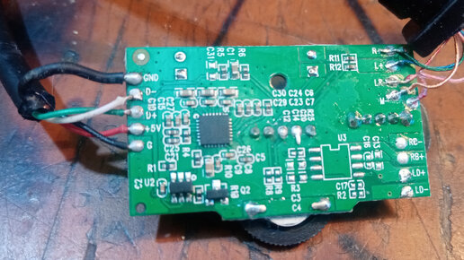 Это коротенькая заметка для тех, кто совсем новичок, но что-то пытается делать сам. Итак, типичная проблема: вырвался USB провод и теперь неизвестно где что было. В моём случае это наушники Cosmo с собственной USB звуковой картой. Наступили на провод и вырвали его с корнем. К счастью плата не повреждена и нам нужно только припаять все на место. Здесь нам повезло и на платке все подписано. Разберёмся. Кабель тут с правильными цветами проводов. Gnd - это экран провода D- это data минус. Белый провод...