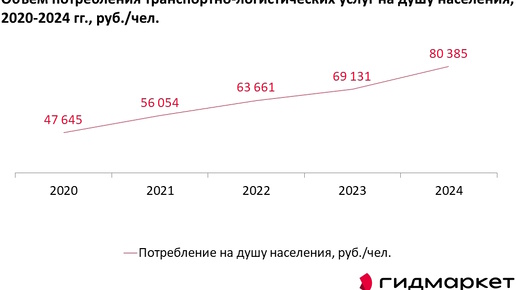 Транспортно-логистическая отрасль России продолжает развиваться не только в части инфраструктуры и цифровизации, но и в направлении изменения спроса. В последние годы растёт потребление логистических услуг на душу населения, усиливается конкуренция между операторами, а клиенты становятся более требовательными к качеству и комплексности сервиса. По данным ГидМаркет, рассчитанным на основе статистики Росстата, объём потребления транспортно-логистических услуг на душу населения в России демонстрирует устойчивый рост...