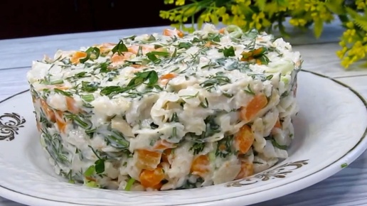 Салат Необычный, напоминает вкус раков, пусть будет раковый. Есть в нём приятная, ни с чем не сравнимая, нотка.
