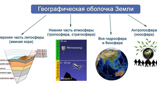 До появления жизни на Земле существовало три внешних оболочки, которые взаимодействовали друг с другом — литосфера, гидросфера и атмосфера. Развитие жизни привело к образованию биосферы — наружной оболочки, в которой существуют живые организмы. Все оболочки Земли изменились и продолжают изменяться под воздействием живых организмов, а впоследствии — под влиянием деятельности людей. Географическая (ландшафтная) оболочка — это непрерывная оболочка Земли, которая охватывает нижние слои атмосферы, верхние слои литосферы, всю гидросферу и биосферу...