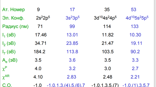 2.1 Галогены. Степени окисления. Диспропорционирование галогенов. Сопоставление окислительных способностей. Галогеноводороды и галогеноводородные кислоты. Особенности HF. Галогениды металлов и неметаллов, их взаимодействие с водой. Оксиды галогенов. К элементам 17-й группы относятся фтор, хлор, бром, иод и астат. Общее название элементов этой группы - галогены (рождающие соли) - их соединения с металлами типичные соли. В основном состоянии имеют общую электронную конфигурацию ns2np5 типичные неметаллы...
