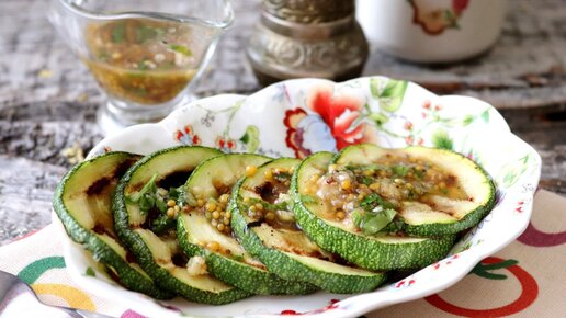 Сочная, ароматная и простая закуска для любителей кабачков. Отличный гарнир для рыбы или курицы. Кабачки можно приготовить на пикнике с дымком, взяв с собой заправку. Ингредиенты Приготовление: 1. Подготовить ингредиенты для закуски. Кабачок (или цуккини) и петрушку помыть и обсушить. 2. Кабачок нарезать на пятачки толщиной примерно 1 см. 3. Хорошо разогреть сковороду-гриль. Моя сковорода с антипригарным покрытием и маслом я её не смазывала. Жарить кабачки до характерных для гриля тёмных полосок...