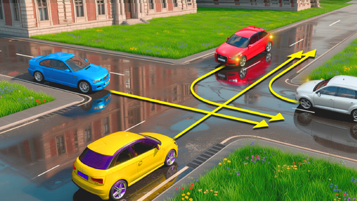 В какой последовательности водители проедут перекресток? 1. Желтый, белый, красный, синий. 2. Белый одновременно с красным, желтый, синий. 3. Белый, желтый, синий, красный. 4. Желтый, красный, синий одновременно с белым. 5. Водители разъедутся по взаимной договоренности. Правильный вариант ответа в конце статьи. Ссылка на ПДД. 13.11. На перекрестке равнозначных дорог, за исключением случая, предусмотренного пунктом 13.11(1) Правил, водитель безрельсового транспортного средства обязан уступить дорогу транспортным средствам, приближающимся справа...