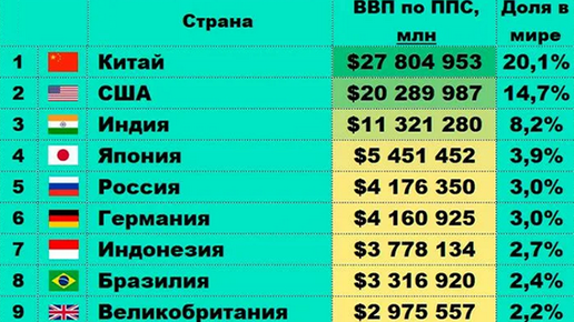 В данной статье мы погрузимся в мир ВВП(показатель, который отражает стоимость всех конечных товаров и услуг, произведенных на территории страны за определенный период времени.), рассмотрим десятку стран, занимающих лидирующие позиции по этому показателю. 10 место Франция - 3,688,323 миллиона долларов 9 место Великобритания - 3,776,044 миллиона долларов 8 место Бразилия - 3,782,763 миллиона долларов 7 место Индонезия - 4,023,501 миллион долларов 6 место Россия - 4,649,674 миллиона долларов...