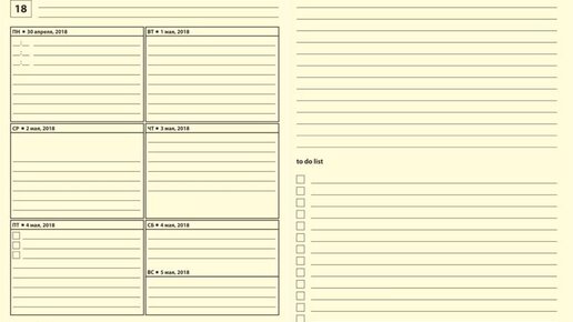 Планирование на неделю — очень удобная штука. Особенно удобно для тех, кто пишет не много заметок в течении дня, а лишь самое основное. Преимущества недельных разлиновок: 1. Дни слева — список задач справа. Планы на каждый день и отдельно на неделю В этом типе планирования, можно распределить все важные дела, которые привязаны к конкретным дням с левой стороны. А с правой стороны остаётся место для планов, которые обязательно нужно сделать и заметок в свободной форме. На правой страничке можно записывать какие-то дела, которые не выполнишь за один день...