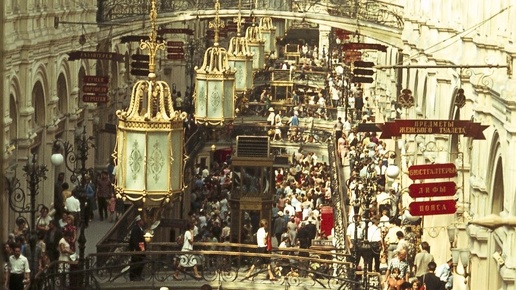 Перед вами — завораживающий снимок легендарного ГУМа (Главного универсального магазина) на Красной площади, запечатлевший ритм жизни советской Москвы. Величественные своды, изысканные подвесные фонари,...