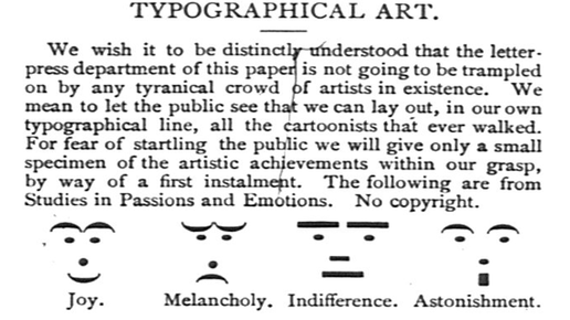 19 сентября праздновали день рождения смайлика во всём мире. Символы помогают выразить чувства и эмоции. Разнообразие первых смайлов было скудным, только радость и грусть. Со временем люди придумали «остальные чувства». Кто же первый придумал смайлики? Археологи находят в раскопках сосуды, документы и переписки людей, на которых изображены современные символы. В 1881 году в Америке журнал юмора и сатиры Puck поместил заметку, которая называлась «Типографическое искусство». Ниже были приведены примеры, выражающие: удовольствие, грусть, равнодушие и удивление...