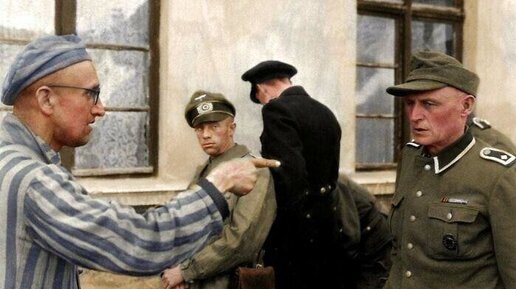 1945 год. Советский военнопленный, после полного освобождения концлагеря Бухенвальд, указывает на бывшего охранника, жестоко избивавшего заключённых