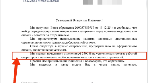 Я получил ответ от Почты России. И теперь уверен, что завтра в отделении всё будет так же Указали начальнику”. Как формальный ответ Почты России доказал, что система не работает Друзья, пришел ответ из центрального офиса Почты России на мою жалобу по поводу хамства в отделении на Уральской, 186. Давайте вместе проведем юридическую и управленческую рецензию на этот документ. Почта официально признала, что отказ оператора в приеме неоформленных онлайн отправлений - недопустим. Это важный момент, так как фактически опровергает слова сотрудницы о том, что я «должен был всё сделать в приложении»...