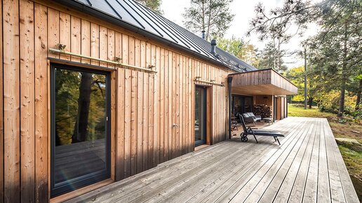 Простая деревянная конструкция имеет основное центральное пространство, открытое к каркасу крыши. Эта большая, хорошо освещённая многофункциональная комната с кухней, ведущей в столовую и гостиную. В тёплое время года можно полностью открыть стеклянную стену и соединить внутреннее пространство с открытой деревянной террасой. Таким образом, можно создать большую зону отдыха, которая ненавязчиво стирает границу между природой и домом. Другие комнаты меньше, предназначены только для сна. Стеклянные детали идеально смотрятся, учитывая тот факт, что дом полностью встроен в лес...