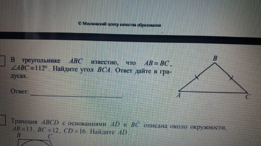 Всем привет,мои юные и не очень любители пошуршать мозгами! 🧠 Сегодня найдем угол. В обычном треугольнике! Хотя...нет. Не обычном,а равнобедренном. В треугольнике ABC известно,что AB=BC,угол ABC=112. Найдите угол BCA...