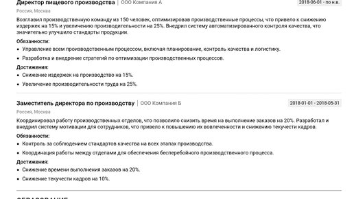 Пример резюме директора пищевого производства 2025 - Полный